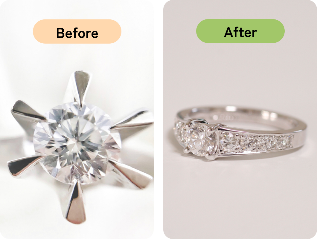 お手持ちのジュエリーをいかして、お好みのデザインにリフォームいたします。 立爪の婚約指輪やお母様から譲り受けたペンダントなど、大切な想い出と共に静かに眠っているジュエリーをよみがえらせませんか?